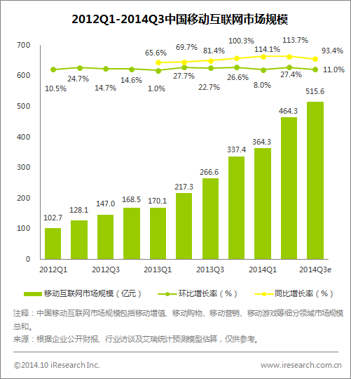艾瑞咨詢數(shù)據(jù)顯示,2014年第三季度中國(guó)移動(dòng)互聯(lián)網(wǎng)市場(chǎng)規(guī)模達(dá)到515 6億元,環(huán)比增長(zhǎng)11 0%,同比增長(zhǎng)93 4%。移動(dòng)互聯(lián)網(wǎng)市場(chǎng)經(jīng)由近幾年的快速