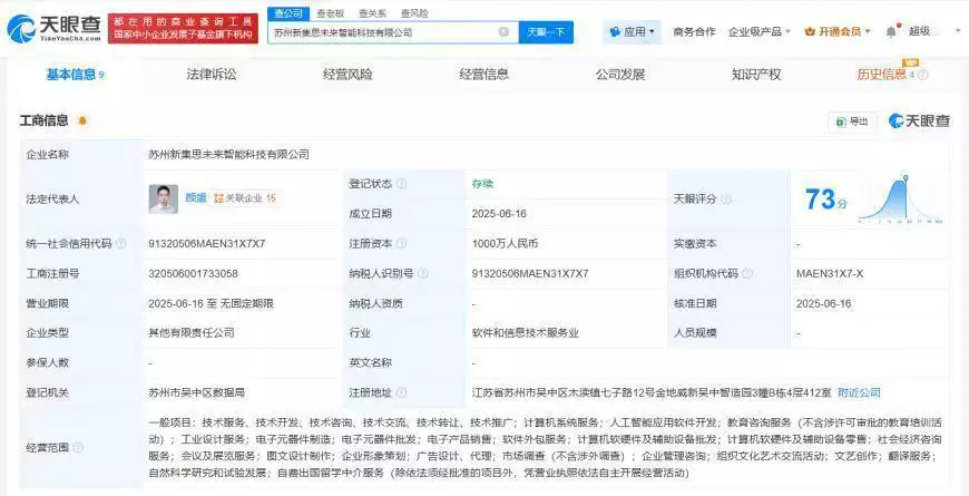 近日,蘇州新集思未來智能科技有限公司成立,法定代表人為顏盛,注冊資本1000萬人民幣,經(jīng)營范圍包括計算機系統(tǒng)服務(wù)、人工智能應(yīng)用軟件開發(fā)、